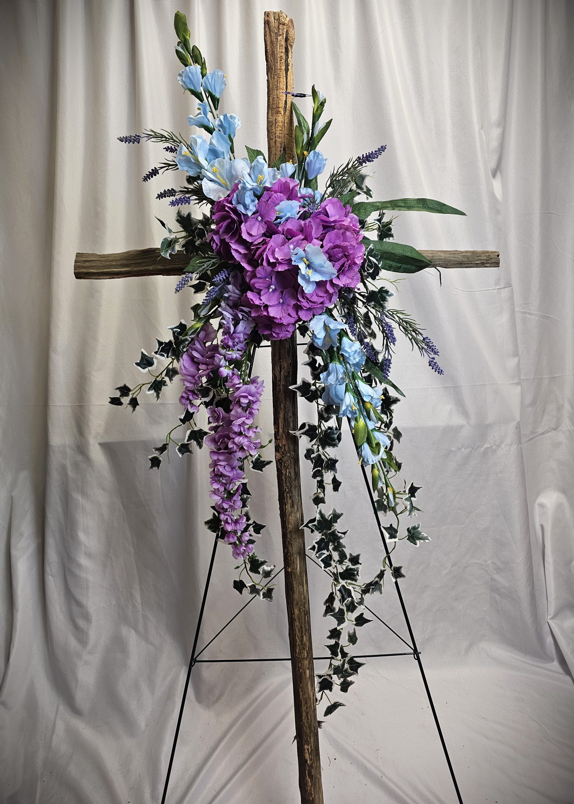 This lovely easel is designed with beautiful blue and purple silk flowers and greenery. Standing at 5 1/2ft. tall x 5ft. wide on a wooden cedar cross.