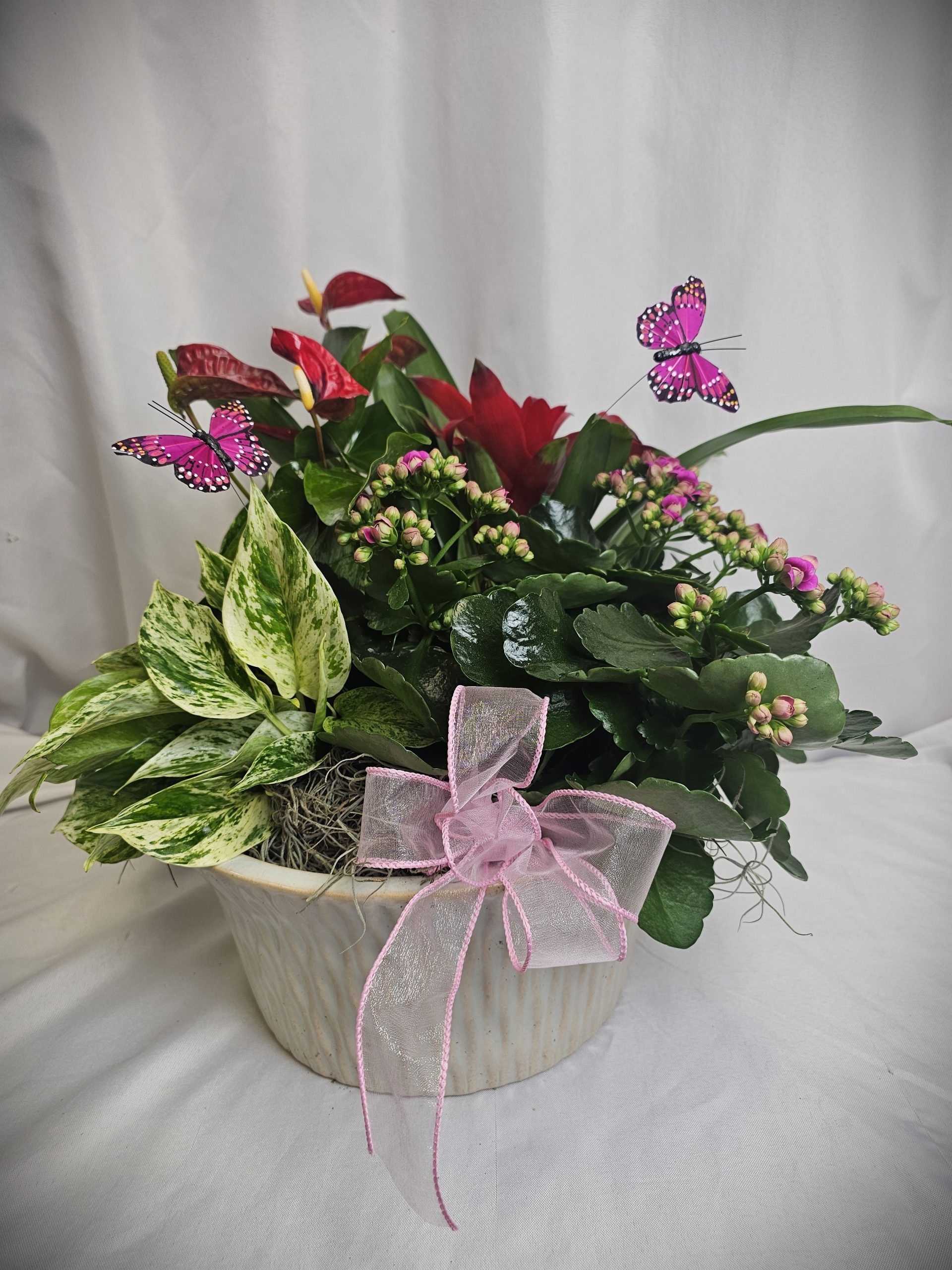 Beautiful ceramic medium white dish garden, 18″ tall and 12″ wide. Blooming bromeliad, kalanchoes, and lush greenery. Adorned with floating pink butterflies and satin pink ribbon.