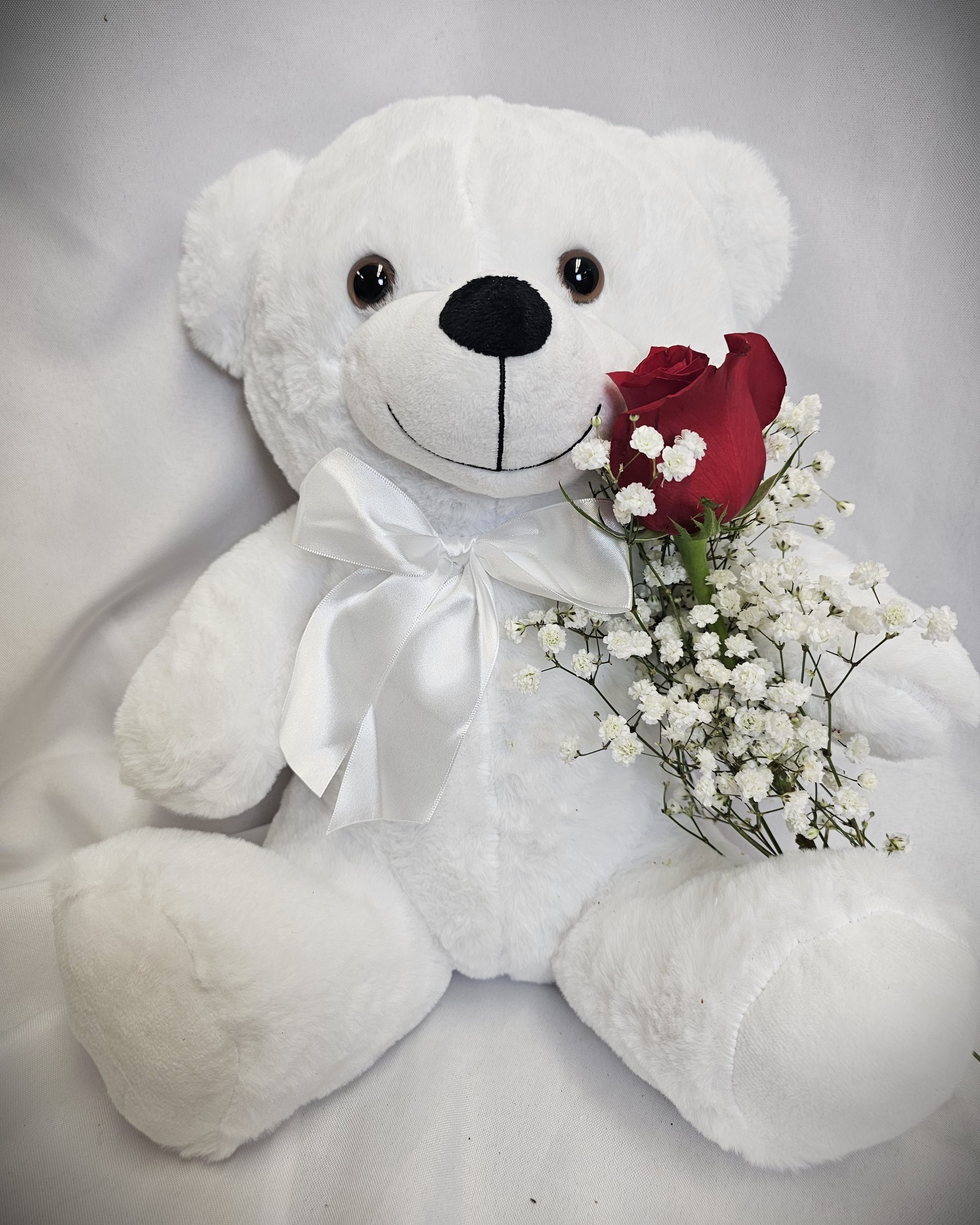 This adorable 15 in. white teddy bear brings with him a premium rose (color choice) surrounded by lovely baby’s breath. Can also be paired with other floral arrangements.