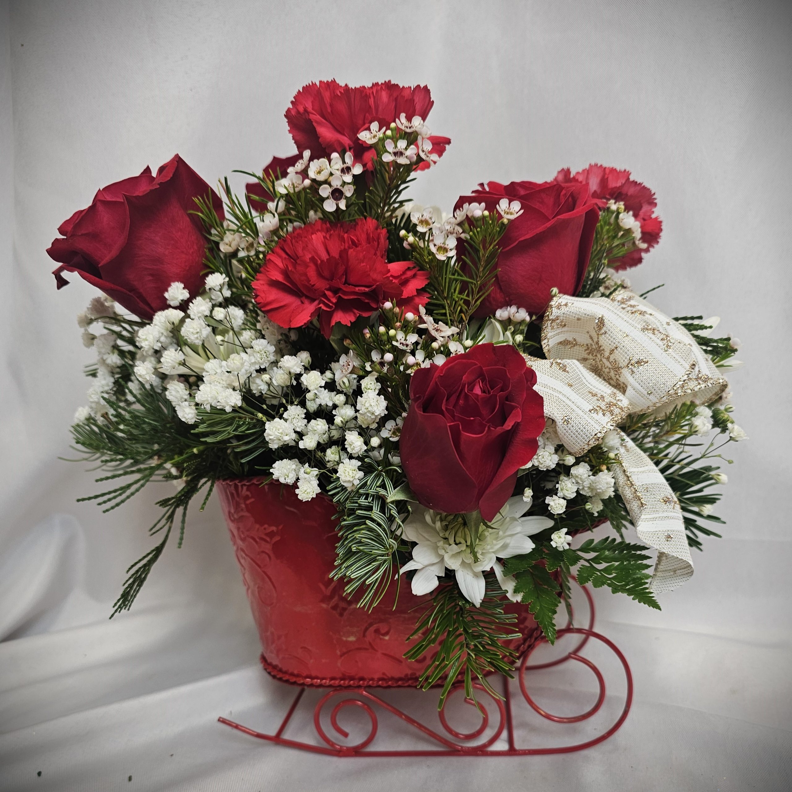 14″ × 11″ wide, adorable Christmas Sleigh. Packed full of premium red roses, red carnations, white poms, wax flower and baby breath.